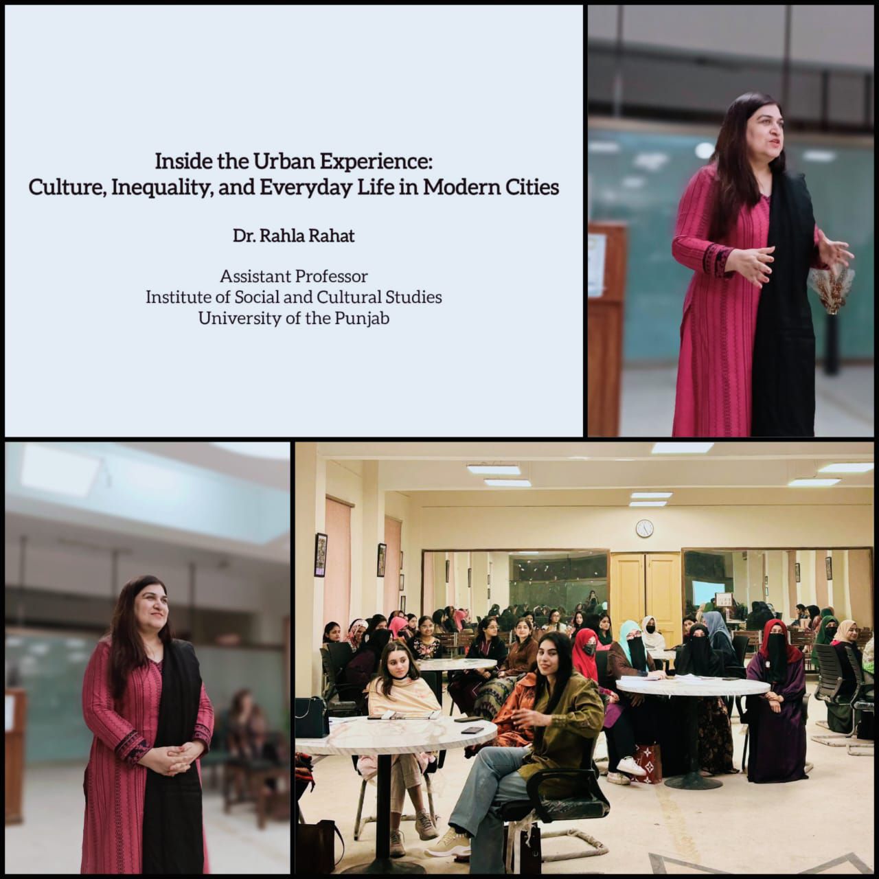 The Department of Sociology, LCWU, organized “A Series of Lectures,” a flagship academic effort to promote critical thinking and broaden sociological understanding. The second lecture, “Inside the Urban Experience: Culture, Inequality, and Everyday Life in Modern Cities,” commenced with the Holy name of Allah and the national anthem, followed by an insightful discussion on the social realities of urban life. Guest speaker Dr. Rahla Rahat elaborated on cultural diversity, class structure, and everyday inequalities in modern cities. Dr. Asma Seemi Malik underscored the importance of studying urban challenges for equitable development. Organised by Dr. Kiran Ikram and Ms. Komal Riaz Cheema, the session concluded with the Head of Department presenting a souvenir and delivering the vote of thanks.
