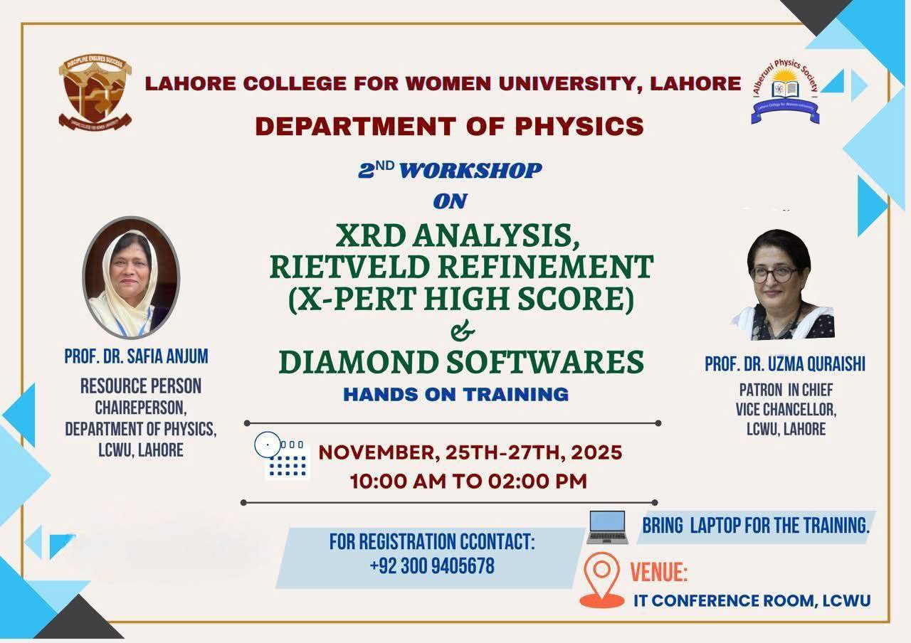 The Department of Physics, LCWU, successfully concluded its 2nd Workshop on “XRD Analysis, Rietveld Refinement (X-Pert High Score) & Diamond Softwares,” held from November 25–27, 2025. The hands-on training, conducted under the patronage of Prof. Dr. Uzma Quraishi, Vice Chancellor and Patron-in-Chief, and led by Prof. Dr. Safia Anjum, equipped participants with practical expertise in advanced material characterization techniques.