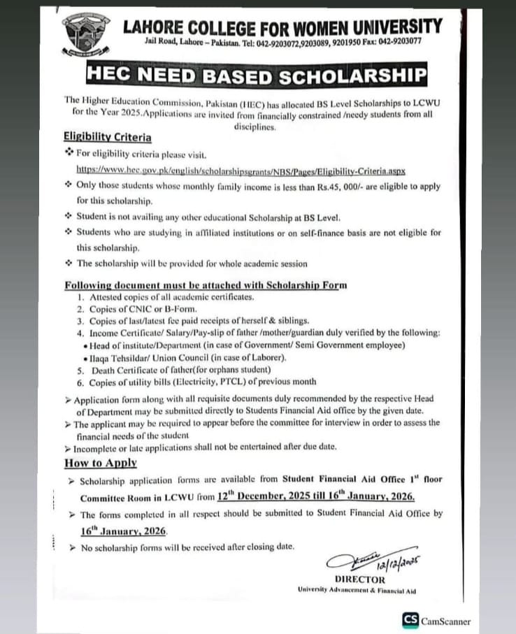 HEC NEED BASED SCHOLARSHIP for BS (HONS)