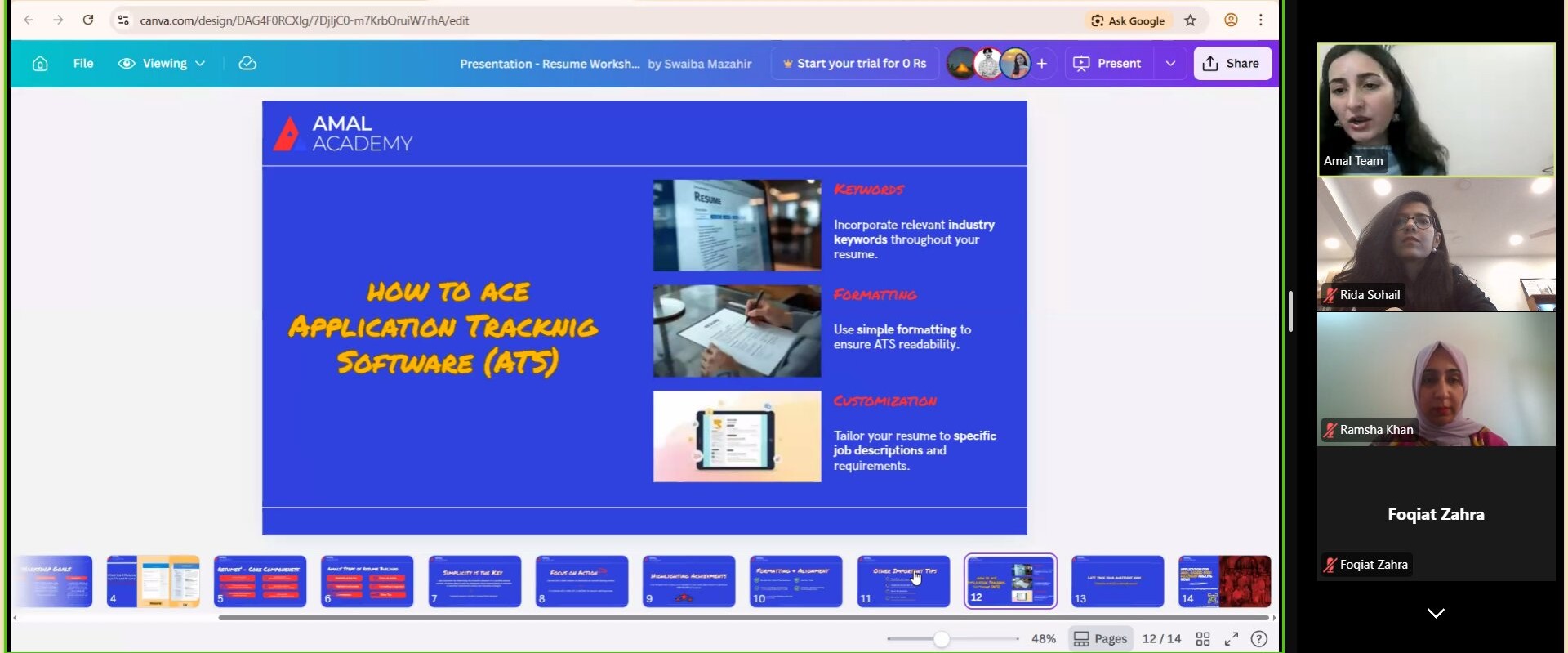 On March 12, 2026, The Centre for Career Counseling and Job Placement (CCJP), in collaboration with Amal Academy, organized an online Career-Prep Workshop for students. The session focused on resume writing and aimed to help participants learn how to effectively present their skills, experiences, and achievements in a professional resume.