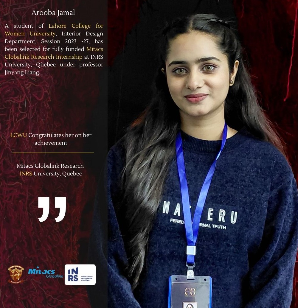A proud moment for Lahore College for Women University as Arooba Jamal, a 6th semester BFA Interior Design student, secures the prestigious Mitacs Globalink Research Internship 2026 under the patronage of the Worthy Vice Chancellor, Prof. Dr. Uzma Quraishi and Head of Interior Design Department Ms. Farhana Naz.