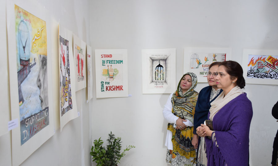 Prof. Dr. Bushra Mirza; Vice Chancellor LCWU inaugurated an exhibition of paintings and posters put up by the students of Intermediate College LCWU on Kashmir issue today i.e 22-01-2020 at 9:30 a.m. in Prof. Zamurad Safdar and Dr. Bushra Khan Art galleries at LCWU. Almost 60 paintings were exhibited. A large number of students turned up and were impressed by the effort. At the end the Vice Chancellor shared very encouraging remarks and appreciated the work of the students and the faculty.