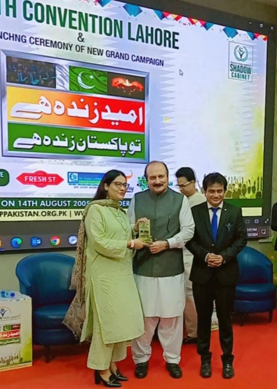 Ms. Sana Asif, Faculty member of Intermediate College & Pakistan Studies Department received an award from Rana Mashood Ahmed at the Youth Convention held at Qadaffi Stadium for her contributions as a teacher, motivational speaker, entrepreneur, marvellous speaker, researcher and an inspiration for youth.