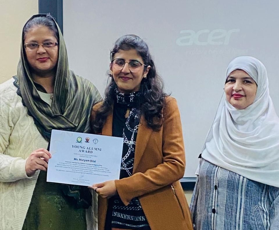 The Department of Biotechnology, LCWU hosted a motivational session with its distinguished alumna, Ms. Maryam Bilal, Inspector (Investigation) at the Federal Investigation Agency FIA. She shared her inspiring journey and presented on "From the Corridors of LCWU to the Field of Law Enforcement," highlighting women's roles in law enforcement.