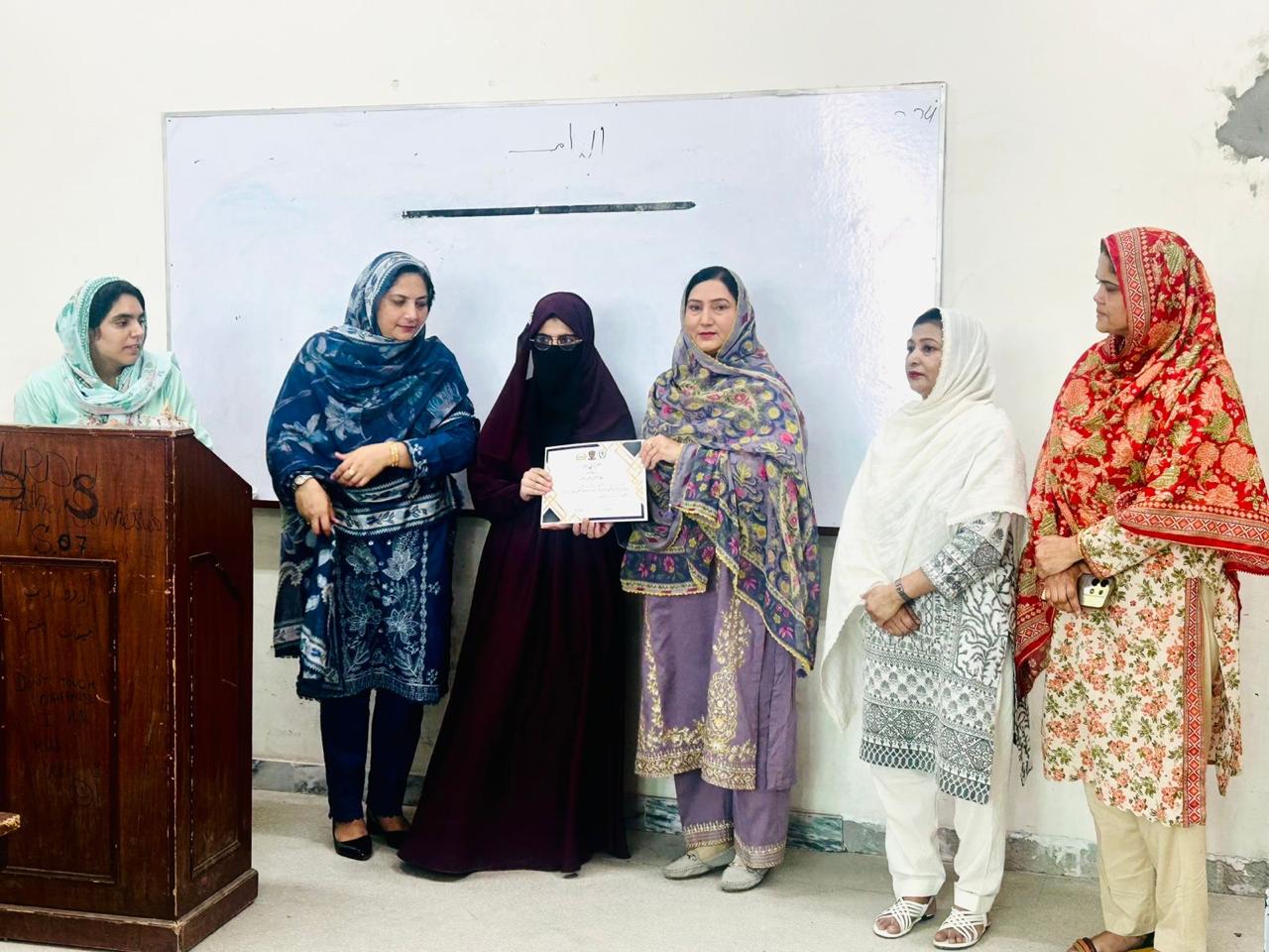 کاعنوان:"انتہا پسندی اور نسلِ نو کا کردار " اور افسانے کا عنوان: "تقلید "تھا۔اوّل، دوم اور سوم پوزیشن حاصل کرنے والی طالبات کو تعریفی اسناد سےنوازا گیا۔ منصنفین کے فرائض ڈاکٹر نائلہ انجم اور ڈاکٹر شبنم نیاز نے سر انجام دیے۔ مضمون نویسی میں اوّل پوزیشن بہیج مصطفیٰ، دوم طیبہ ارشد اور سوم پوزیشن نور فاطمہ نے حاصل کی۔ جب کہ افسانہ نویسی کے مقابلے میں ماہاشہباز اوّل، رُوبا دوم اور عائشہ علی شیر سوّم پوزیشن کی حق دار قرار پائیں۔