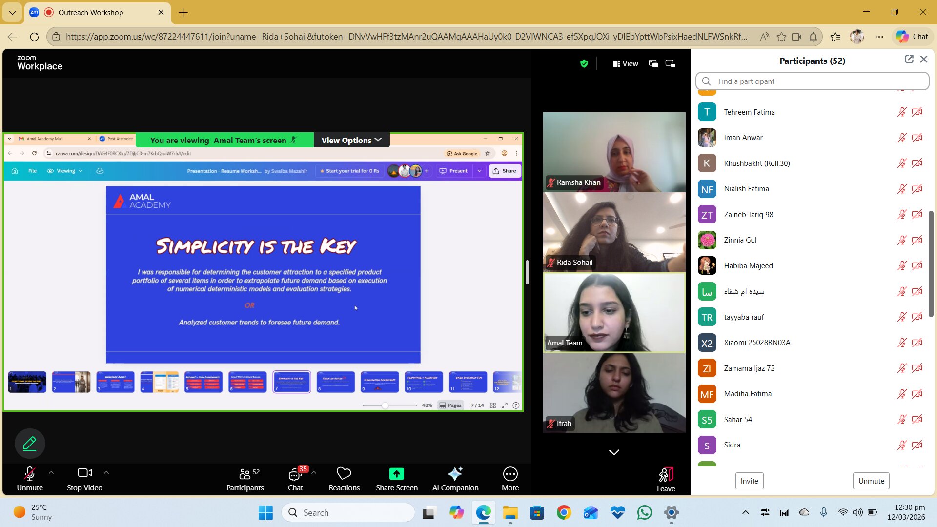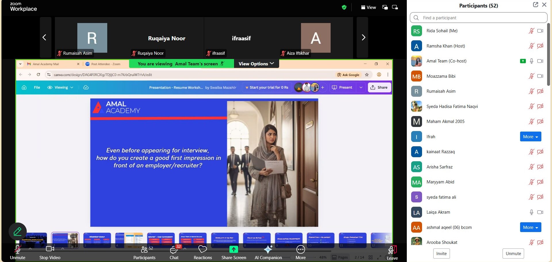 The workshop was facilitated by Ms. Ramsha Khan, Program Manager at Amal Academy, and Ms. Rida Sohail, Manager CCJP, LCWU. The facilitators shared practical tips on structuring resumes, avoiding common mistakes, and tailoring resumes for different job opportunities. Students actively participated in the session and gained valuable insights into improving their career profiles.