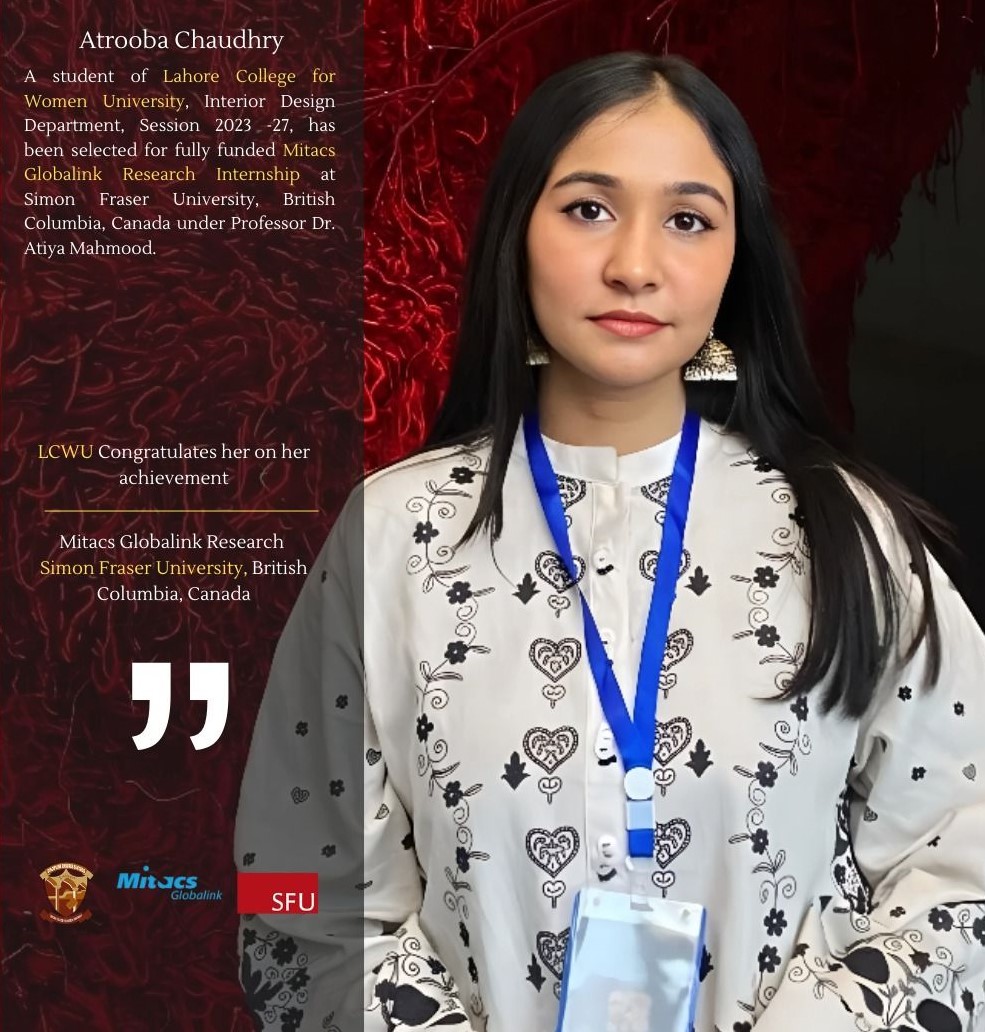 A proud moment for Lahore College for Women University as Arooba Jamal, a 6th semester BFA Interior Design student, secures the prestigious Mitacs Globalink Research Internship 2026 under the patronage of the Worthy Vice Chancellor, Prof. Dr. Uzma Quraishi and Head of Interior Design Department Ms. Farhana Naz.